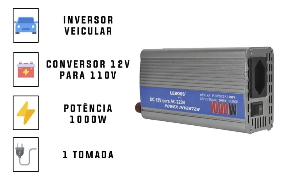 O Inversor Conversor de Tensão LEBOSS LB-521A 1000W foi desenvolvido para transformar a energia 12V da bateria do veículo em 220V, possibilitando o uso de equipamentos elétricos convencionais mesmo fora da rede elétrica.