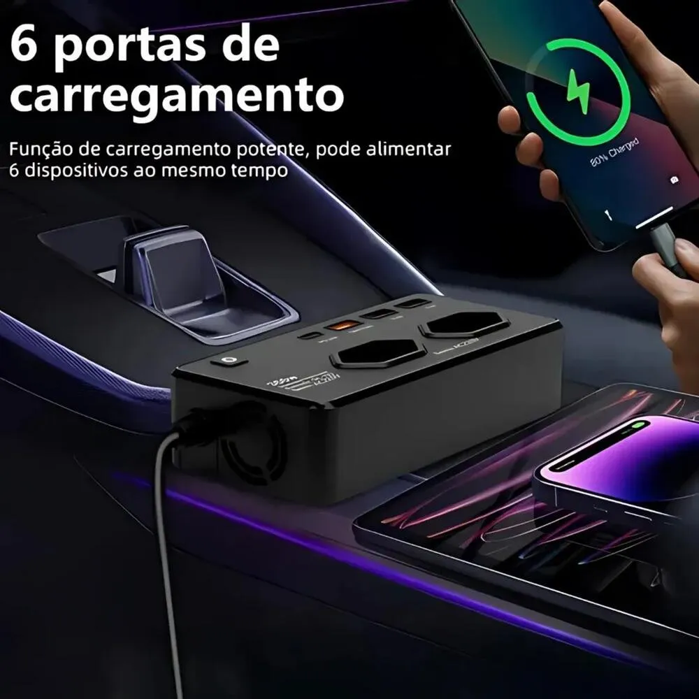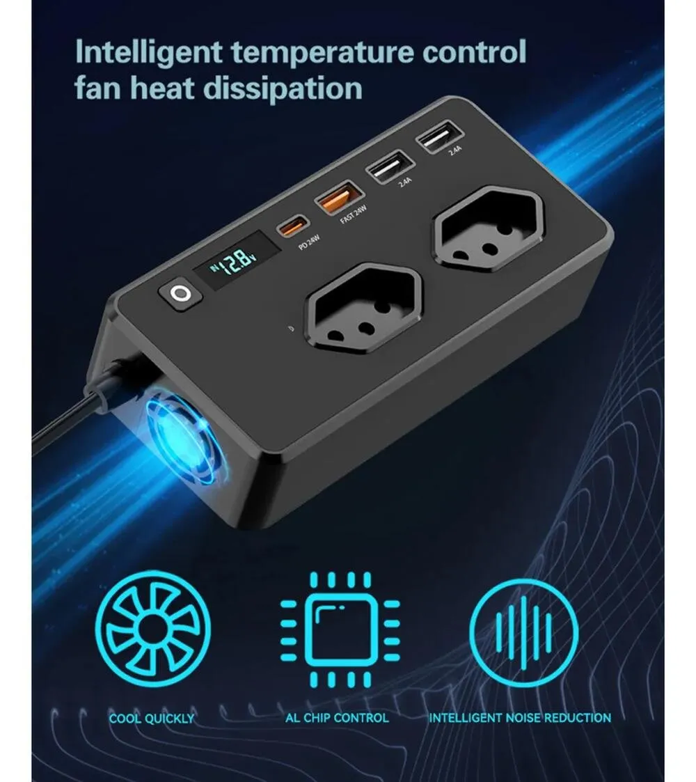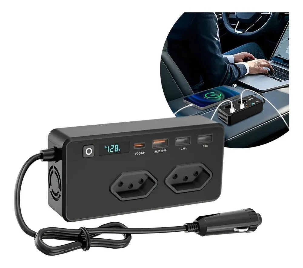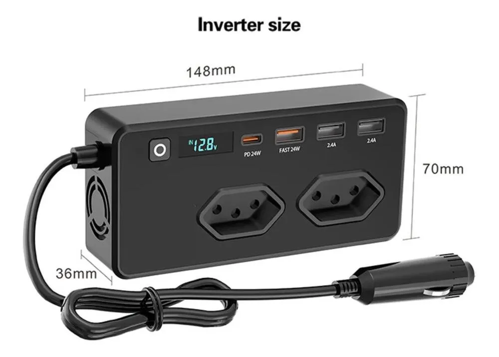 INVERSOR AUTOMOTIVO VEICULAR CONVERSOR ELETRICO 12V PARA 127V COM 2 TOMADAS 3 USB 1 TIPO-C