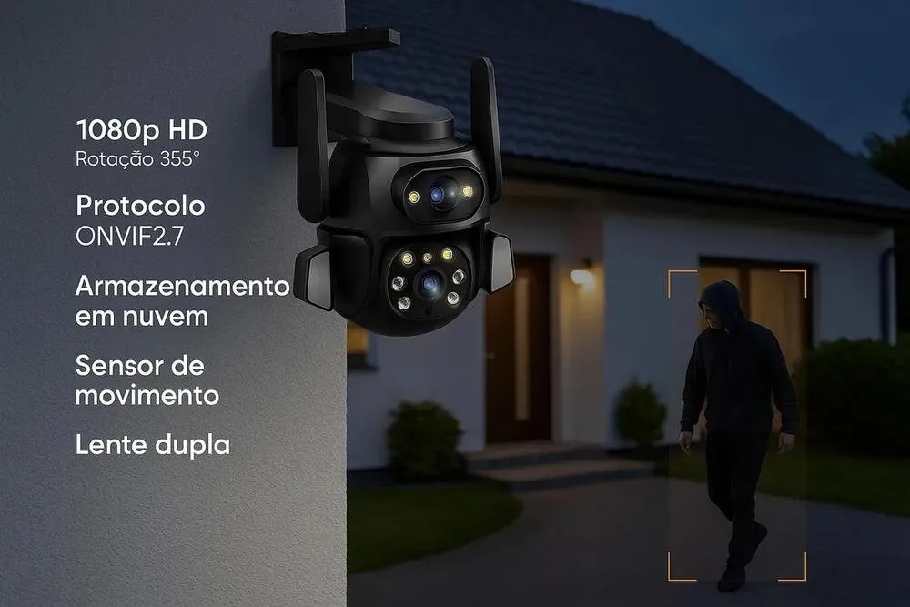 A câmera identifica movimentos humanos e realiza rastreamento automático vertical e horizontal, acompanhando pessoas em tempo real para maior segurança.